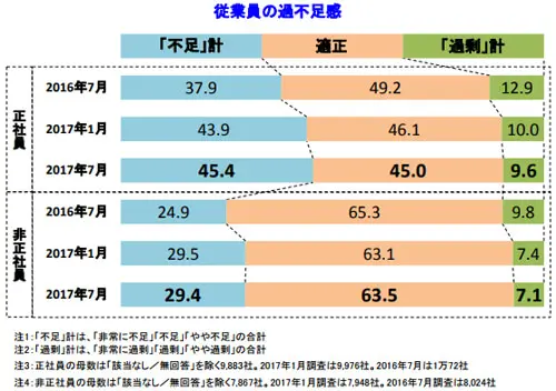 1: 紅あずま ★ ©2ch.net 2017/09/10(日) 00:23:29.30 ID:CAP_USER9 強まる人手不足、45.4%の企業が「正社員不足」 求人難の倒産も昨年上回るペースで推移 MONEYzine:2017/09/09 18:00 http://moneyzine.jp/article/detail/214858 帝国データバンクは8月24日、「人手不足に対する企業の動向調査(2017年7月)」の結果を発表した。 調査対象は全国の企業2万3,767社で、有効回答企業数は1万93社。調査期間は7月18日から31日にかけて。 現在の従業員の過不足状況を聞いたところ、正社員について「不足」していると回答した企業は45.4%で、昨年7月の調査時より7.5 ポイント増加した。「適正」は45.0%で同4.2ポイント減少、「過剰」は9.6%で同3.3ポイント減少した。「不足」と回答し... -